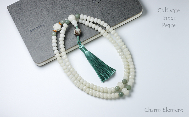 一个典型的念珠由108颗珠子组成,虽然也可以找到不同珠子数量的变化。数字108在许多灵修和文化背景下都具有重要意义。这些珠子通常以循环方式串在一起(成为项链或手串),有一个较大的珠子,称为“导师”珠子或“梅鲁”珠子,标志着循环的开始和结束。然而,值得注意的是,存在数字变化。一些念珠可能有不同数量的珠子,例如54(108的一半)或27(108的四分之一),也有手腕念珠,珠子较少,可以作为单圈的手串佩戴。具体的珠子数量可以根据个人喜好、传统或念珠使用背后的意图而变化。