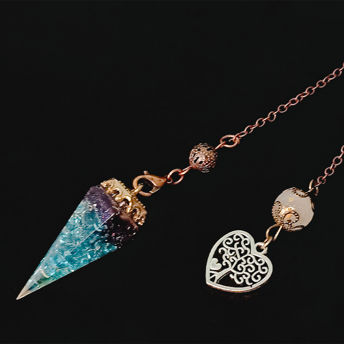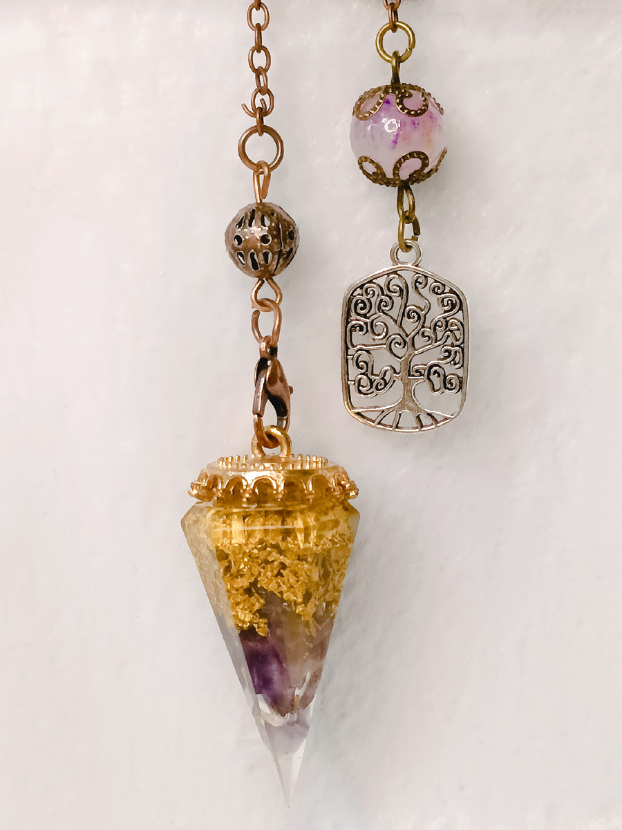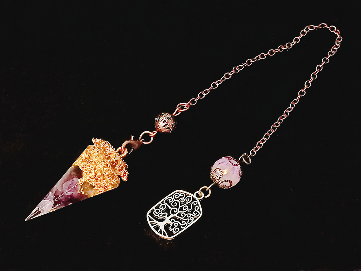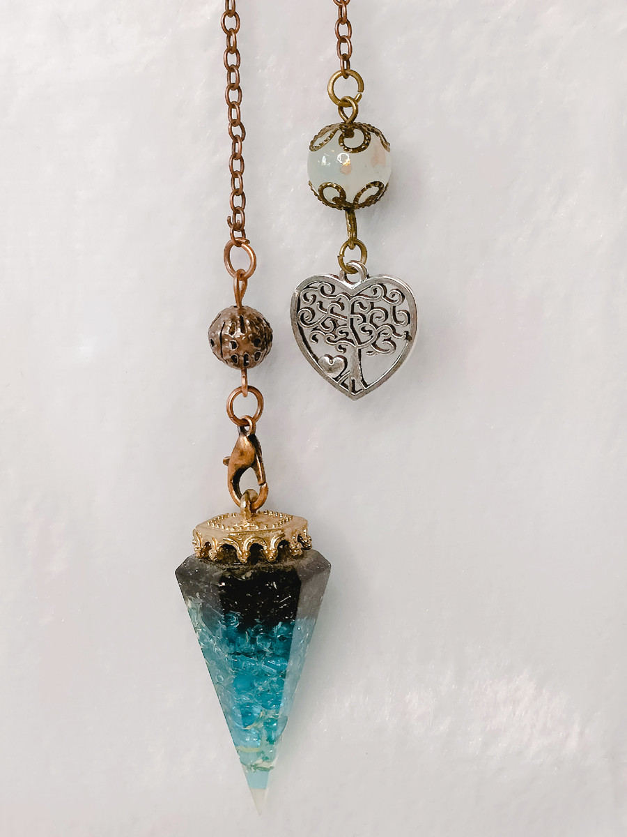 This exquisite pendulum is meticulously crafted, bringing together a harmonious blend of premium crushed chip stones and shimmering particles, all elegantly encased within a translucent resin matrix. The crushed chip stones, carefully selected for their quality and vibrational properties, create a captivating tapestry of colors and textures within the resin. The interplay of light and depth is further enhanced by the addition of sparkling particles, which lend a mesmerizing brilliance to the pendulum’s appearance.